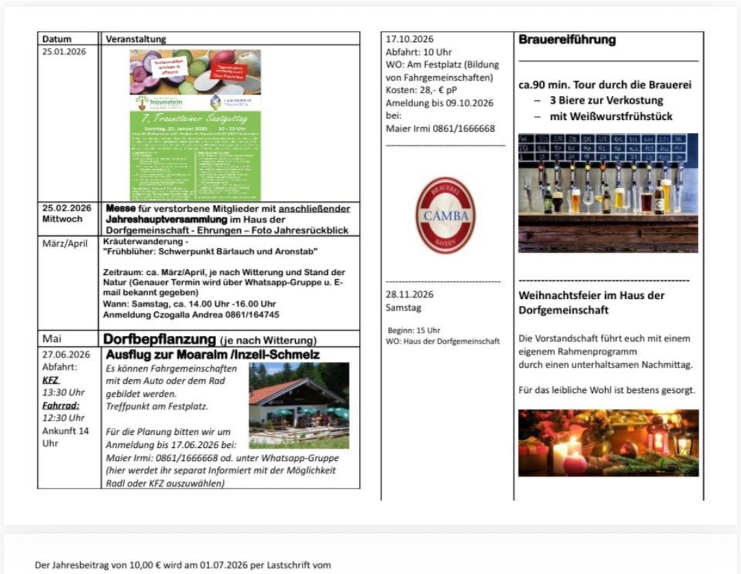 Die Mitglieder dürfen sich auf eine Kräuterwanderung im Frühling, einen Ausflug zur Moaralm im Juni, eine Betriebsbesichtigung der Brauerei Camba im Oktober und eine Weihnachtsfeier mit Überraschungen Ende November freuen.
